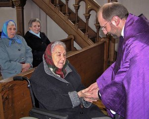 Äußeres Zeichen der Krankensalbung ist die Handauflegung und Salbung eines kranken Menschen mit dem Krankenöl.