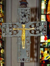 Über dem Altar hängt seit dem 1. April 1976 ein Altarkreuz, welches ebenfalls durch Olaf Höhnen geschaffen wurde. Es handelt sich um ein Hängekreuz aus Bronze, bei dem die Kreuzbalken in der Form eines Weinstockes mit Weinblättern und Reben gestaltet sind. Der Gekreuzigte ist nicht als Leidender oder Toter gezeigt, sondern als Sieger über den Tod. Auf der Rückseite des Altarkreuzes hat der Künstler das Lamm Gottes dargestellt, und zwar in dem seit dem Mittelalter anzutreffenden Typ des Lammes mit dem Kelch für das Blut aus der Seitenwunde. Das Lamm Gottes ist in der Kunst das häufigste Symbol des eucharistischen Christus, und in jeder Messe beten wir vor der Kommunion mit den Worten Johannes des Täufers: „Lamm Gottes, du nimmst hinweg die Sünde der Welt“ (Joh. 1,29).