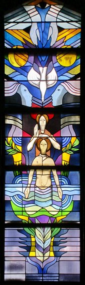 Jesus und der Täufer stehen im Jordan. Dass dieses Wasser Leben für die Menschen bedeutet, wird durch die grünen Pflanzen angedeutet. Auch die Erde im Vordergrund des Bildes wird vom Jordanwasser getränkt. Leben aber kommt allein von Gott. Auch das ist in der Bildsprache gesagt. In der Spitze des Fensters befindet sich das Auge, das Symbol Gottes. Von ihm aus senkten sich die Hände Gottes – Symbole seines Schöpfer- und Erlöserhandelns – auf das Weltall herab, das durch Sonne und Mond angedeutet ist. Gottes Handeln aber geschieht im Heiligen Geist, der in der Gestalt der Taube erscheint und sich nach unten auf die Welt senkt. Gott handelt nicht selbst, sondern handelt durch Boten (Angelus = Bote, Botschafter). Die beiden Engelköpfe deuten darauf hin. Der eigentliche Bote Gottes ist aber Jesus von Nazareth, der im Johannesevangelium ja auch „das Wort“ genannt wird (Joh 1,1).