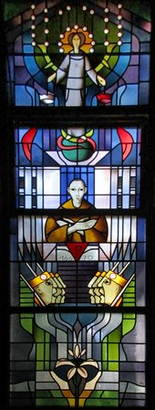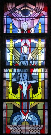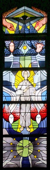 In der Mitte des Fensters ist Christus dargestellt, der das Buch mit den sieben Siegeln (Offb 5,1) in der Hand hat. Ihn umgeben wieder die Engel als Boten Gottes. Zwei von ihnen kann man wieder als Botenengel deuten, zwei von ihnen, wegen der roten Flügel, als Engel des Gerichtes, das in großer Liebe zur Welt geschieht. (Rot ist bekanntlich die Farbe der Liebe!) Christus kommt auf den Wolken des Himmels, welche die Erde bedecken. Die im Kreis um die Erde angedeuteten anderen Sterne sollen andeuten, dass die Vollendung der Welt ein kosmisches Geschehen ist, das nicht allein die Erde betrifft, sondern das ganze Weltall. lm oberen Teil des Fensters finden wir die Symbole der vier Evangelisten: den Adler für Johannes, den Löwen für Markus, den Menschen (oder Engel) für Matthäus, den Stier für Lukas. Wenn die Weit vollendet wird, dann wird sie so gestaltet, wie es Jesus Christus in den Evangelien angesagt hat. Der Maßstab für das Urteil, ob die Welt Gottes Willen entspricht, ist eben das Wort Gottes, wie es sich in den Evangelien findet. ln der Spitze des Fensters findet sich erneut das (große) Auge als Symbol Gottes, in dessen Namen die Welt vollendet und gerichtet wird.