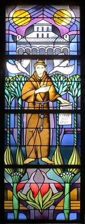 ln der Mitte des Bildes steht der hl. Franz im Ordensgewand der Franziskaner. In der Hand hält er eine Schriftrolle mit der Aufschrift: Pax huic domui (übersetzt: Friede diesem Hause). Mit diesem Haus kann sowohl die ganze Schöpfung wie auch die Kirche als das Haus Gottes gemeint sein. Darauf deuten Sonne und Mond und das Kirchengebäude hin, die über der Figur des hl. Franz dargestellt sind. Das Kirchengebäude erinnert an die Legende, dass Franz in einer Vision den Auftrag erhielt, sich um die Wiederherstellung der „verfallenen Kirche“ zu kümmern. Das hat er getan, indem er einen wesentlichen Beitrag zur Bewältigung des zu seiner Zeit in der Kirche tobenden „Armutsstreites“ geleistet hat. Sonne und Mond, die Vögel und die Pflanzen weisen auf die Schöpfungsfrömmigkeit des hl. Franz hin. Und diese ist (vgl. auch oben) christologisch verwurzelt.