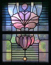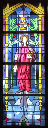 Die hl. Cäcilia als Patronin der Kirchenmusik und der Kirchenchöre. Das Fenster zeigt im unteren Teil eine Orgel, das eigentliche Instrument für den Gottesdienst. Darüber sind die Sänger des Chores dargestellt. Über ihnen erscheint Cäcilia im roten Mantel (Hinweis auf ihr Martyrium). Die Palme ist Zeichen des Martyriums, das Schwert deutet die Art ihrer Hinrichtung an.