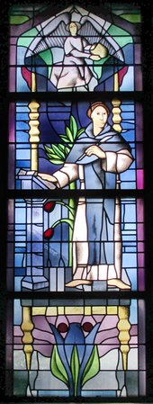 Der hl. Albert von Köln (* ca. 1200, + 15.11.1280) ist – traditionell – als Dominikaner an einem Schreibpult mit der Feder in der Hand dargestellt. Die Feder weist ihn als großen Theologen und Schriftsteller aus, der die Fülle des Wissens seiner Zeit beherrschte. Der Engel oben im Bild trägt die Mitra in der Hand, die liturgische Kopfbedeckung des Bischofs. Das weist darauf hin, dass Albert 1260 - 1262 das Amt des Bischofs von Regensburg innehatte. Er ist deswegen nicht im Ornat eines Bischofs dargestellt, weil er dieses Amt, das damals immerhin die Stellung eines Reichsfürsten mit sich brachte, nur solange ausgeübt hat, bis er die zerrütteten Verhältnisse im Bistum Regensburg geordnet hatte. Verzicht auf Macht war ein Wesensmerkmal seines Handelns. Das bedeutet aber nicht einen Mangel an Autorität, die ja nicht mit Machtausübung verwechselt werden darf. Diese Autorität hat er mehrmals als Schiedsrichter zwischen der Stadt Köln und ihrem Bischof durch Schiedssprüche zur Geltung gebracht und dadurch viel Blutvergießen verhindert. Die Blumen im Bild sind Hinweis auf diesen Dienst am Leben der Menschen.