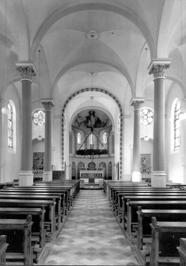 Bereits in den späten 1940er Jahren hatte Pastor Ossenbrink damit begonnen, die Ausstattung der Kirche im Geiste der liturgischen Erneuerung durchgreifend zu modernisieren. Die als überladen empfundenen neogotischen Altäre wurden ebenso wie die Kanzel abgebaut. Die bislang hinter einem Vorhang verborgenen Nischen der Apsis wurden nach Entwürfen des Künstlers Hans Hansen mit Malereien und Mosaiken im frühchristlichen Stil ausgestattet, während die Wände und Säulen statt der starkfarbigen Fassung nun eine Bemalung in dezenten Tönen erhielten.
