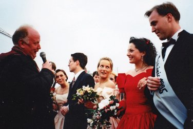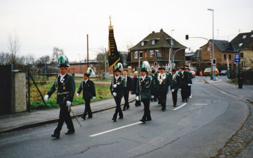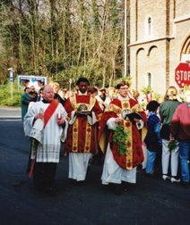 Ebenso bildete sich nach fast einem halben Jahrhundert im Jahre 1993 in Roisdorf wieder ein Junggesellenverein, die „Echten Fründe“, dessen schmuckes Maikönigspaar natürlich seinen kirchlichen Segen erhielt – hier Daniela Rech und Michael Schumacher von Diakon Theodor Königshofen. Neben ihm bei einer Palmsonntagsprozession zu sehen: die Kapläne Nwokedi Francis Esumesu und Christian Herrmanns.