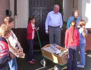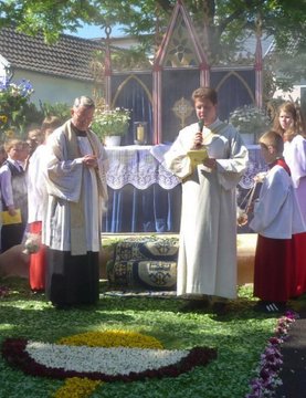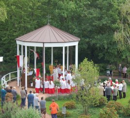 Kleppern und Eiersammeln der Messdiener - Fronleichnamsstation im Brunnenpark