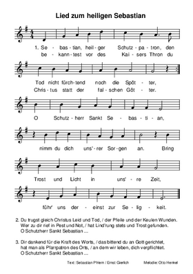 Sebastian Pfriem (1883 - 1958) war in der Zeit nach dem Ersten Weltkrieg bis 1936 Pfarrer in Langenprozelten, einem Ort in Mainfranken, und verfasste das Lied offensichtlich zu Ehren seines Namenspatrons. Dr. Otto Henkel (1909 - 1971) stammte aus Düsseldorf und war ab August 1945 Kaplan in Roisdorf. Dass er der Kirchenmusik in besonderer Weise zugetan war, zeigte sich bereits zu Weihnachten 1945, als er, wie die Pfarrchronik berichtet, das Weihnachtsevangelium von sechs Knaben in deutsch singen (ließ), unterbrochen von Liedern des Volkes.